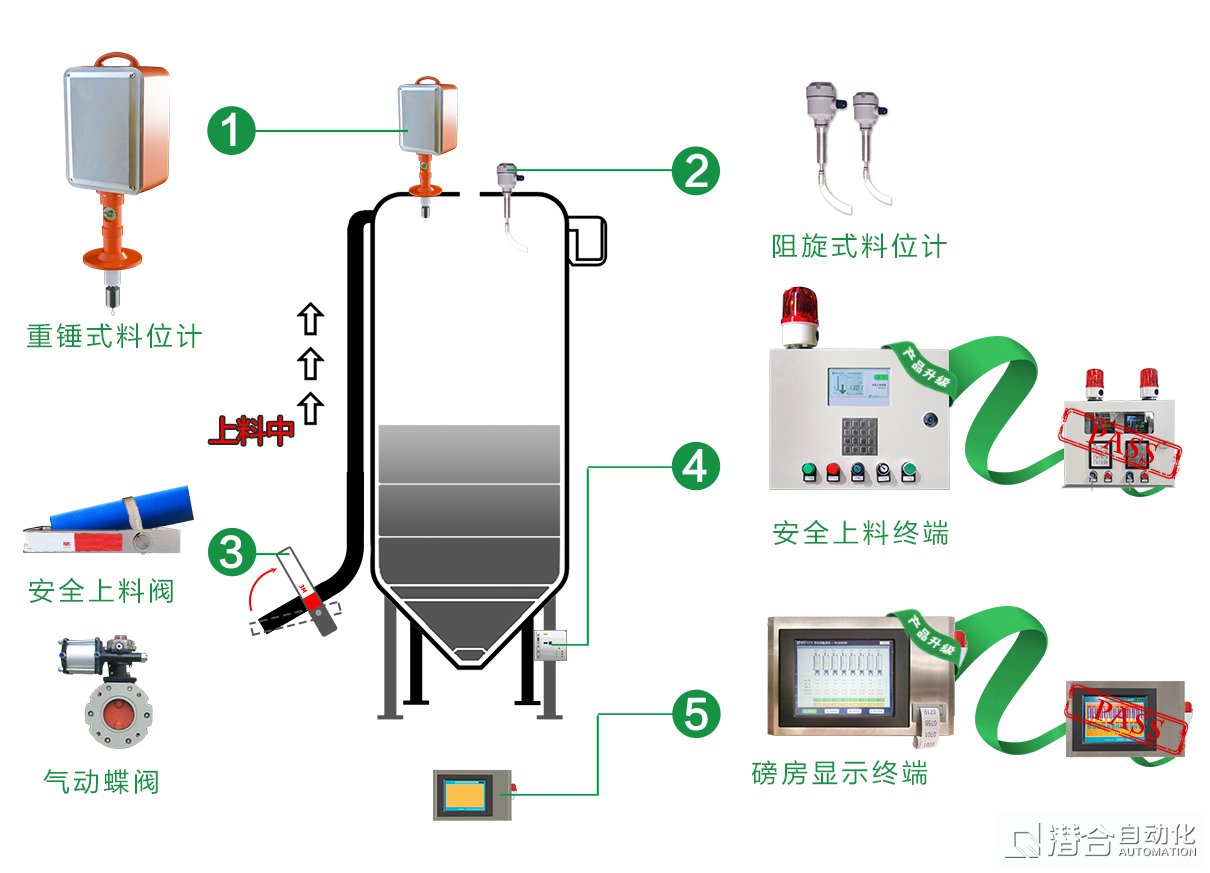 要解決這個(gè)問(wèn)題潛合自動(dòng)化專(zhuān)門(mén)為大型混凝土攪拌站研發(fā)設(shè)計(jì)了料倉(cāng)安全系統(tǒng),我們從實(shí)際出發(fā),來(lái)看看料倉(cāng)安全系統(tǒng)的四大優(yōu)勢(shì):
