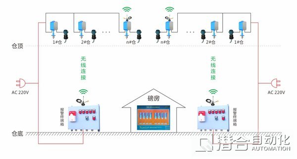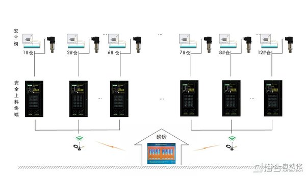 上料口側(cè):上料安全控制終端、電動蝶閥,每個料倉1個,各個終端通過網(wǎng)絡連接。
